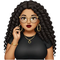 big plus size, latina, darker tan skin, long black curly hair, baddie,pretty, makeup, red lipgloss, black eyeliner, long hair, small gold earrings, black top, black glasses emoji