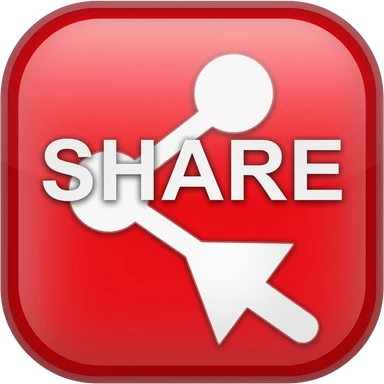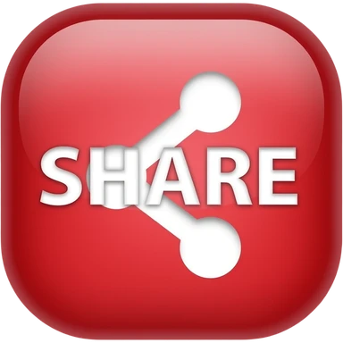 Red 3D share button, white text “SHARE”, arrow icon, glossy, rounded, soft glow, clean background emoji
