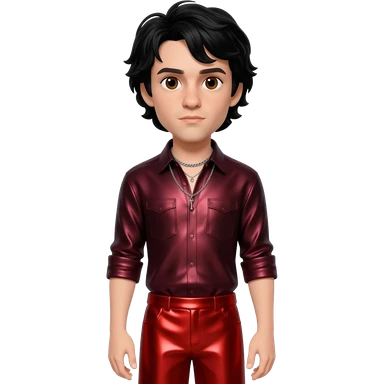 Ezra Miller with brown eyes, black long hair, dark red metallic shirt, red metallic baggy pants, silver necklace emoji