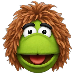 A blue muppet with dark green spiky hair over their eyes, wearing a red scarf emoji