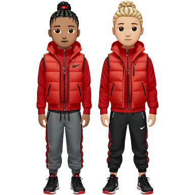 2 boys one wearing red nike tech with a black puffer vest and posing with black shoes and other with cornrows and a grey hoodie with black pants tan emoji
