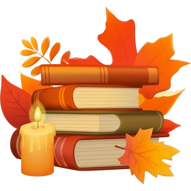 Red-orange-yellow-brown-gradients autumn aesthetic, stack of books, candle, leaves emoji