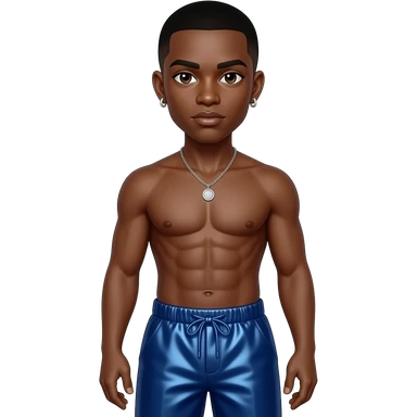 Jay-Z with brown eyes, black buzz cut hair, indigo metallic baggy pants, shirtless with necklace and earrings emoji