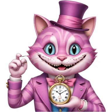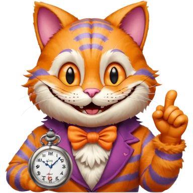 Cheesier cat from Alice in wonderland pointing at a pocket watch wearing a hat emoji