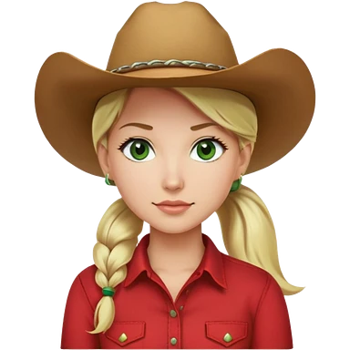 woman red shirt cowboy hat green eyes blonde hair with a ponytail resting on the right shoulder emoji