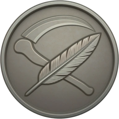 An aged-metal coin, deep-stamped with a stylized, etched scythe and skeletal quill. emoji