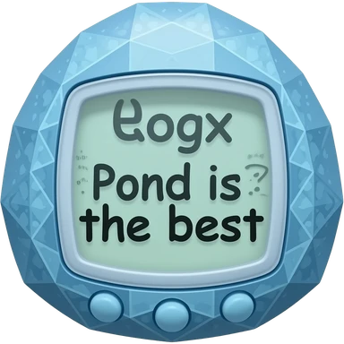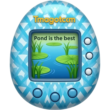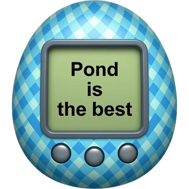 80s vibe blue tamagotchi with patterns on outside that says Pond is the best on the screen emoji