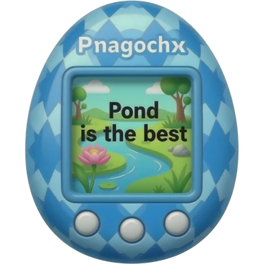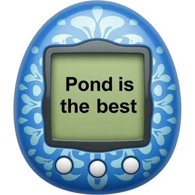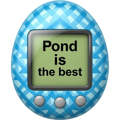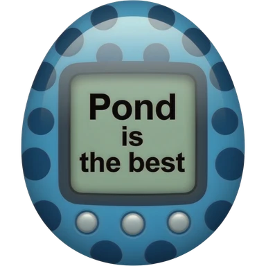 blue tamagotchi with dark dots on outside that says Pond is the best on the screen in black letters and no words on the outside top part emoji