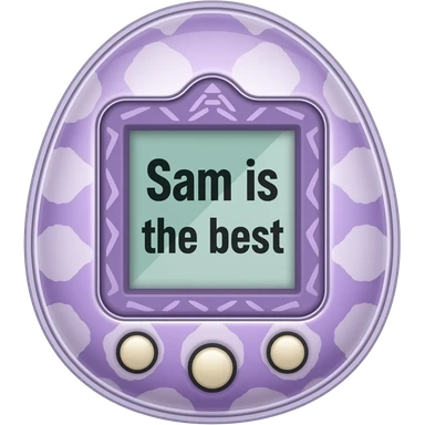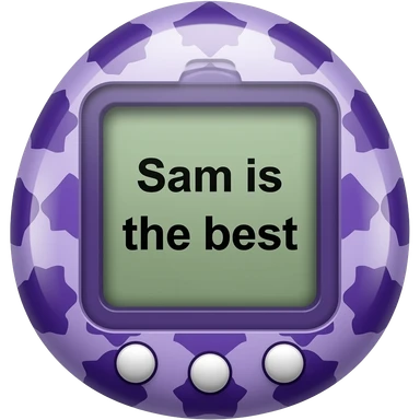 purple tamagotchi with patterns on outside that says Sam is the best on the screen emoji