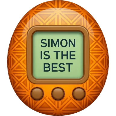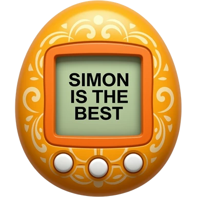 orange tamagotchi with patterns on outside that says SIMON IS THE BEST on the screen emoji
