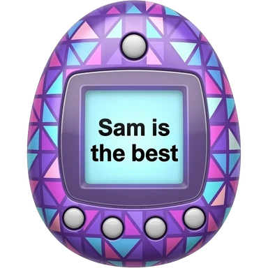 70s vibe purple tamagotchi with patterns on outside that says Sam is the best on the screen emoji