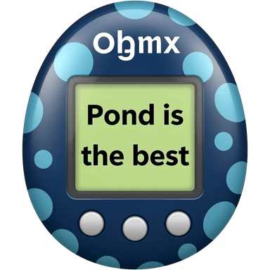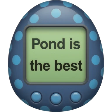 dark blue tamagotchi with light blue dots on outside that says Pond is the best on the screen in black letters and no words on the outside top part emoji