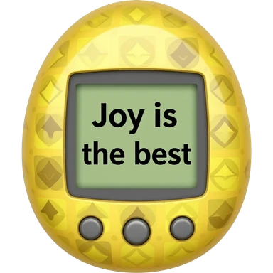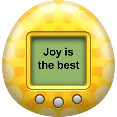 yellow tamagotchi with pattern outside that says Joy is the best on the screen in black letters and no words on the outside top part emoji