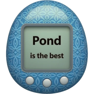 blue tamagotchi with patterns on outside that says Pond is the best on the screen in black letters and no words on the outside top part emoji