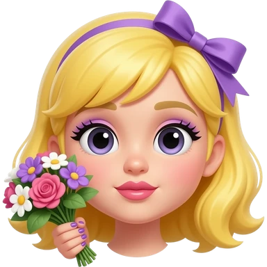 Make an emoji similar to a floating yellow classic head without hair ( like 😔) with reddish pink lip with gloss puckering, eyelashes, purple eyeshadows, big eyes, younger face, lighter yellow, holding a bouquet of flowers, have a ribbon on her head and wears purple polished long nails and nail tips. emoji