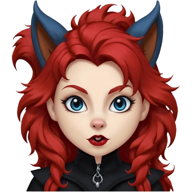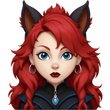 long curly red hair (darker), red pointed ears with black trim, black goth outfits, body and face human, blue eyes, more pointy chin, black lipstick, big fluffy red squirrel tail with black tips, like the attached photo with more outfits and poses, emoji