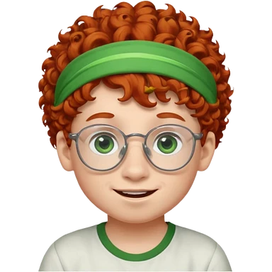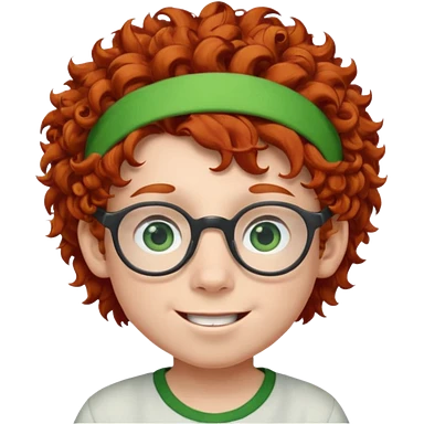 redhead kid with unique face features and very curly hair kid boy happy and big glassess and big nose and very green eyes and headband emoji