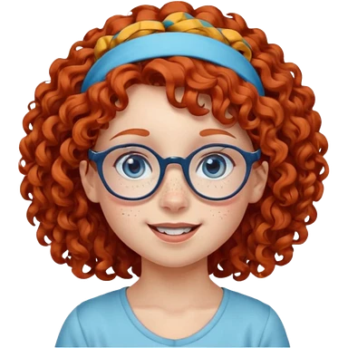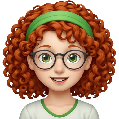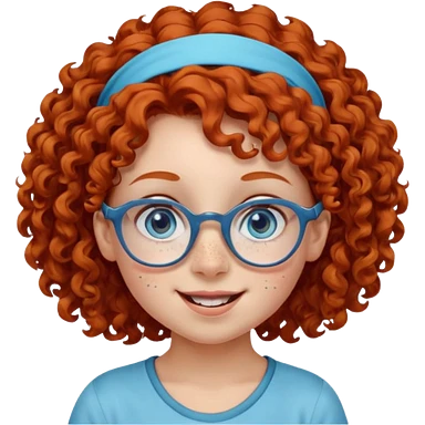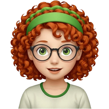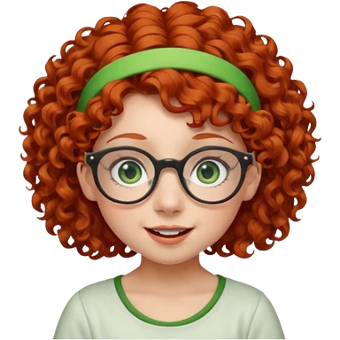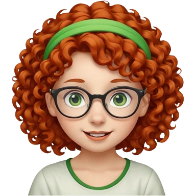 redhead kid with unique face features and very curly hair kid girl happy and big glassess and big nose and very green eyes and headband emoji