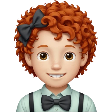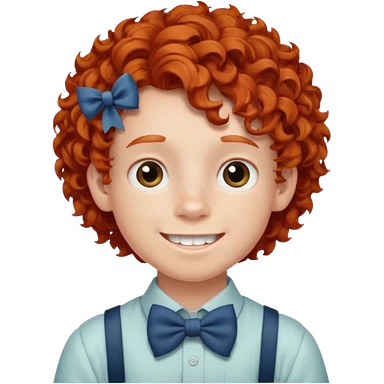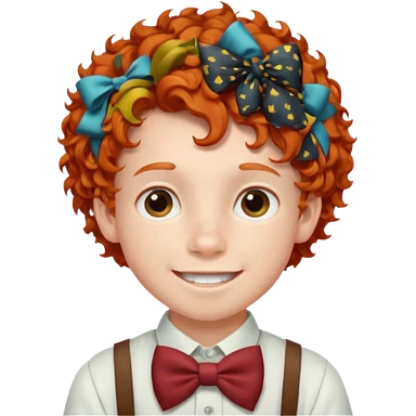 redhead kid with unique face features and very curly hair kid boy happy and braces on teeth, wearing a bow on head emoji