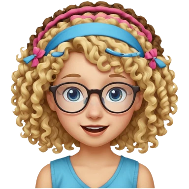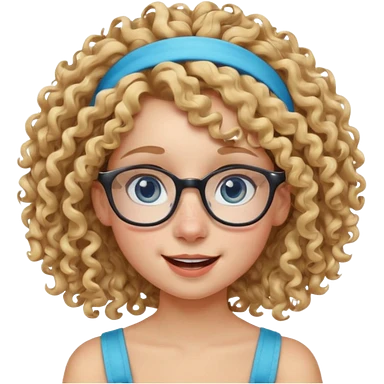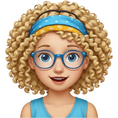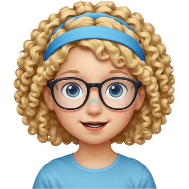 blond kid with unique face features and very curly hair kid girl happy and big glasess and big nose and very blue eyes and headband with freckles emoji