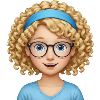 blond kid with unique face features and very curly hair kid girl happy and big glasess and big nose and very blue eyes and headband with freckles kind of nerd looking emoji