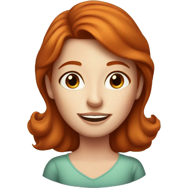 Strawberry blonde woman 30s green eyes with beautiful smile. Long wavy hair. Small breasts. emoji