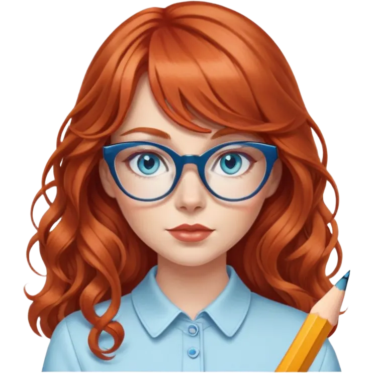 redheaded woman with very long wavy hair and bangs, blue eyes, clear cat-eye glasses, stylish modern outfit, holding a pencil emoji | AI Emoji Generator