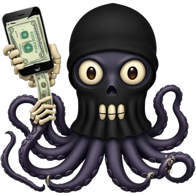 satanic octopus skeleton with scary evil eyes, wearing a black balaclava. 1 tentacle is holding a cellphone, 1 tentacle is holding a bone, 1 tentacle is holding a stack of cash. emoji