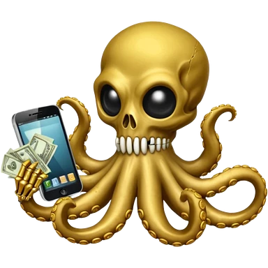 satanic octopus skeleton with scary evil eyes wearing a gold necklace and balaclava. 1 tentacle is holding a cellphone, 1 tentacle is holding a bone, 1 tentacle is holding a stack of cash. emoji
