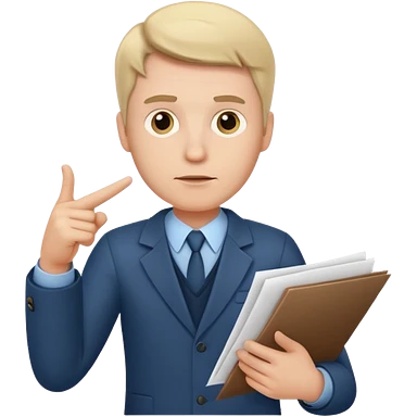 A man stands with a serious face and points his finger at his hand holding papers emoji