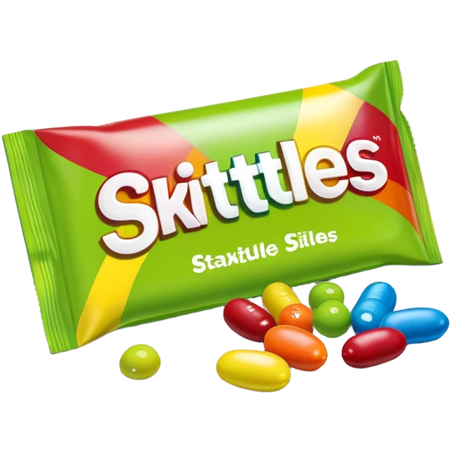 minimalist colorful Skittles candy pack with green candies spilling out emoji