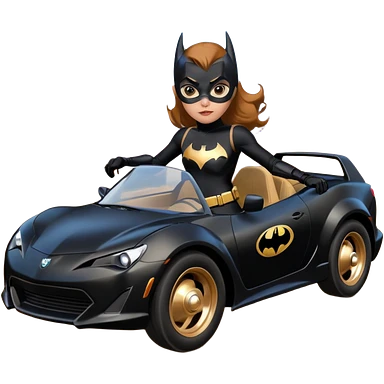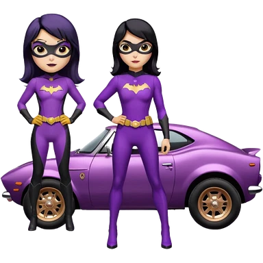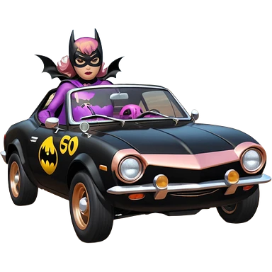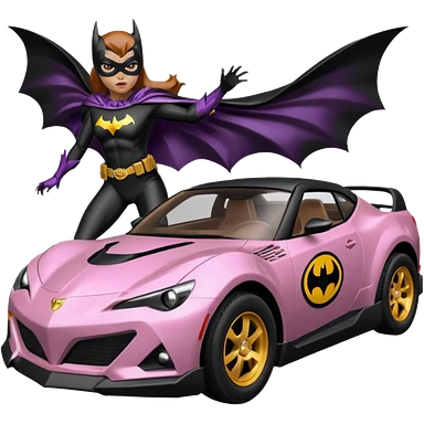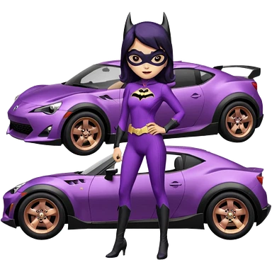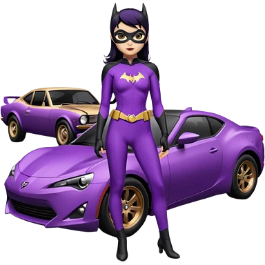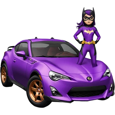 Relaxed adult 60’s Batgirl themed Satin black and rose gold colored Scion FR-S hot rod off road capable (tight fitting purple suit with black hair on her) emoji
