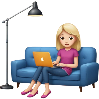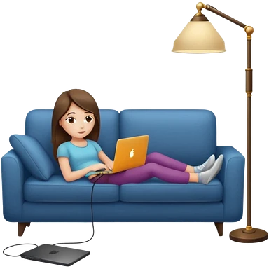A girl is working with a laptop while lying on a sofa, with a floor lamp to the right. emoji