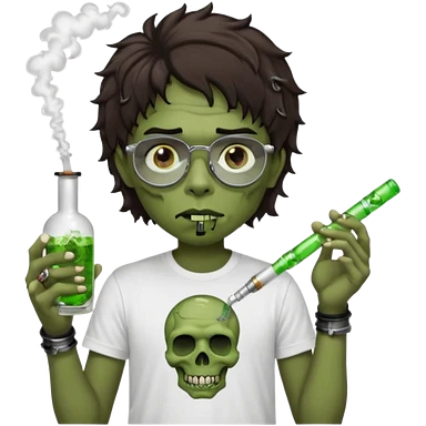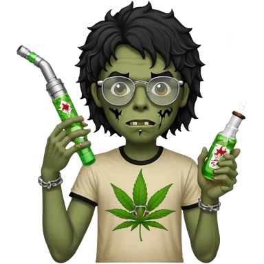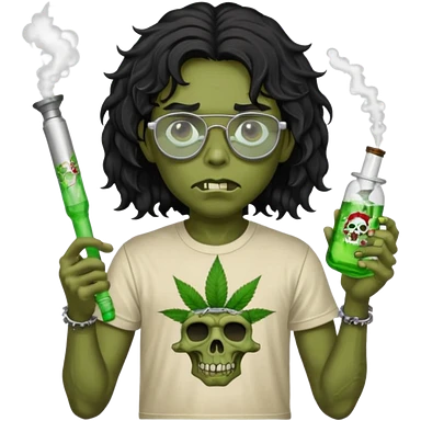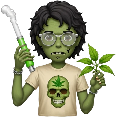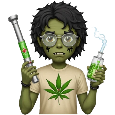 black wavy haired zombie getting stoned with weed t shirt and bong on his hand and wearing chrome hearts glasses emoji