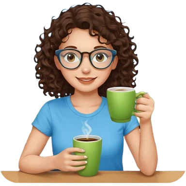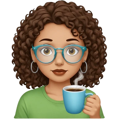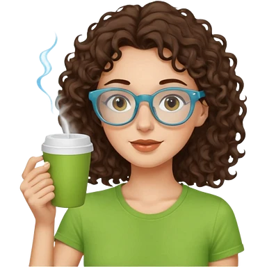 White girl with dark brown curly hair, brown eyes, sky blue glasses, apple green t shirt, drinking coffee emoji