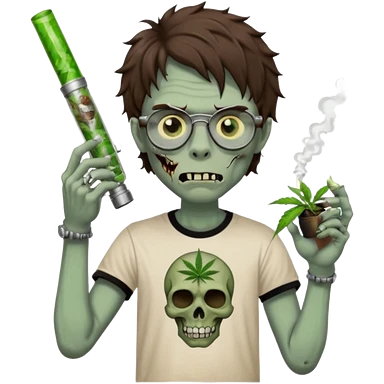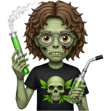 brown wavy haired zombie getting stoned with weed t shirt and bong on his hand and wearing black chrome hearts bifocals emoji