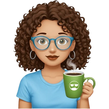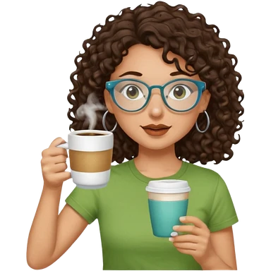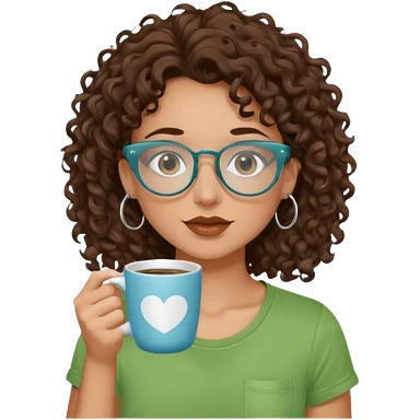 White girl with dark brown curly hair, brown eyes, sky blue glasses, nose piercing septum, green t shirt, drinking coffee from a cup emoji