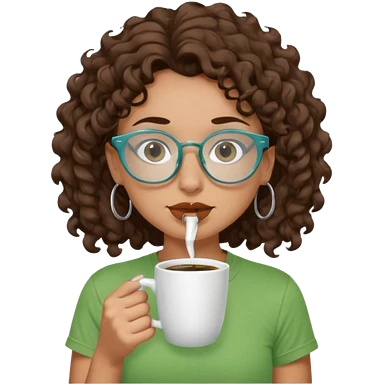 White girl with dark brown curly hair, brown eyes, sky blue glasses, nose ring, green t shirt, drinking coffee from a glass cup emoji
