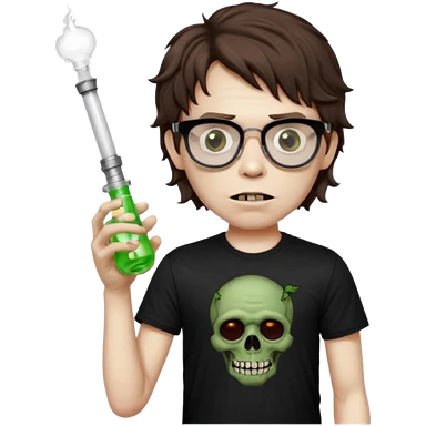 short wavy brown haired zombie getting stoned with weed t shirt and bong on his hand and wearing black chrome hearts bifocals emoji