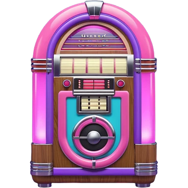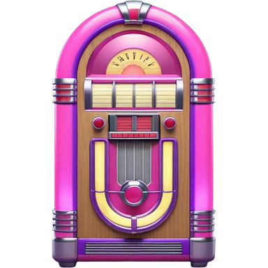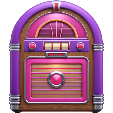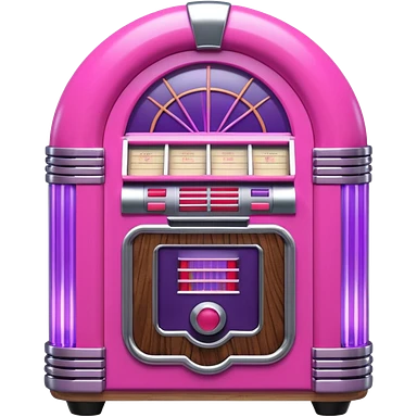 3D render of Jukebox, vintage 1980s audio equipment aesthetic, tactile analog buttons, neon pink and purple light tubes with chrome trim, mixed wood grain and brushed aluminum textures, Apple emoji style, isolated on white background --v 6.0 emoji