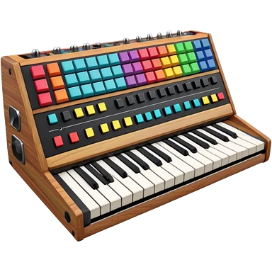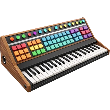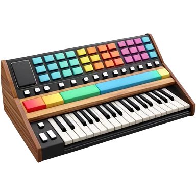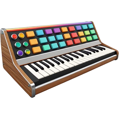 3D render of Synthesizer, vintage 1980s audio equipment aesthetic, tactile analog buttons, black matte keys with colorful rainbow slider knobs, mixed wood grain and brushed aluminum textures, Apple emoji style, isolated on white background --v 6.0 emoji