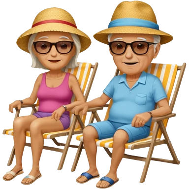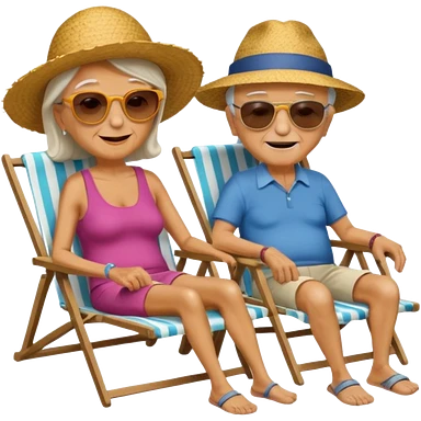 an emoji that shows elderly one slim woman in bikini and one man with dickbauch in bath shorts, both are retired and are lying in sun-chairs at the beach to recover from retiring-stress emoji