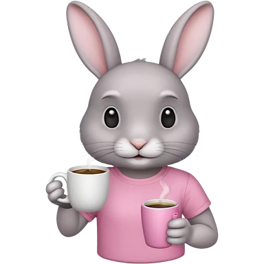 Gray rabbit, wearing pink t-shirt, holding coffee mug emoji