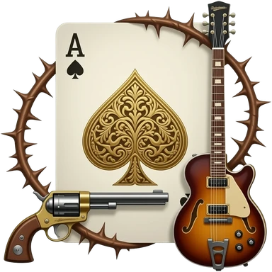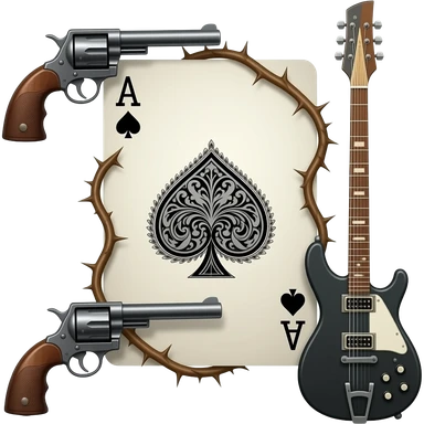 richly ornamented spade ace surrounded by tendrils of thorns and antique 1851 Navy Revolvers and Rickenbacker Motorhead MODEL 4003SW emoji | AI Emoji Generator