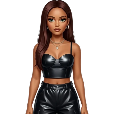 Rihanna with hazel green eyes, long dark auburn straight hair, black metallic sleeveless sweetheart crop top, black metallic baggy pants, necklace and earrings emoji