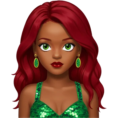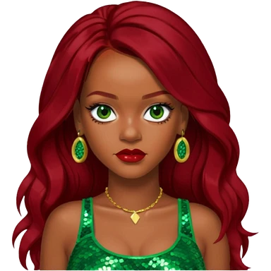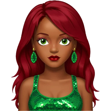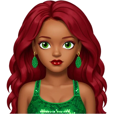 Rihanna with dark red long hair, green sequin crop top, hazel eye emoji