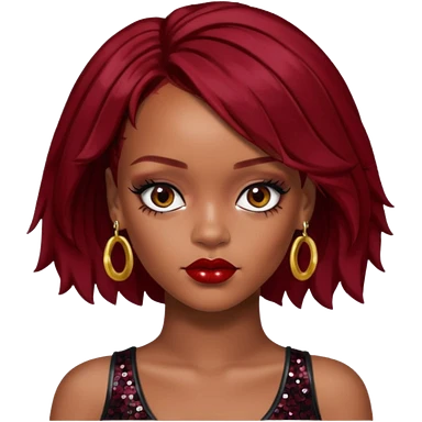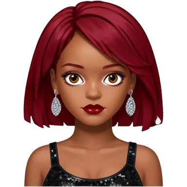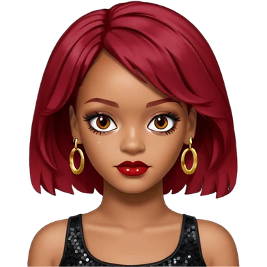 Rihanna with dark red hair, black sequin crop top, hazel eye emoji