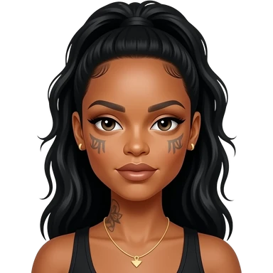 Rihanna with hazel green eyes, long dark auburn straight hair, black metallic sleeveless sweetheart crop top, black metallic baggy pants, necklace and earrings emoji