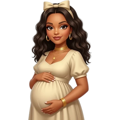 Rihanna with hazel green eyes, long dark auburn straight hair, black metallic sleeveless sweetheart crop top, black metallic baggy pants, necklace and earrings emoji