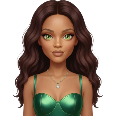 Rihanna with hazel-green eyes, long dark auburn hair, green metallic sweetheart dress, silver necklace emoji